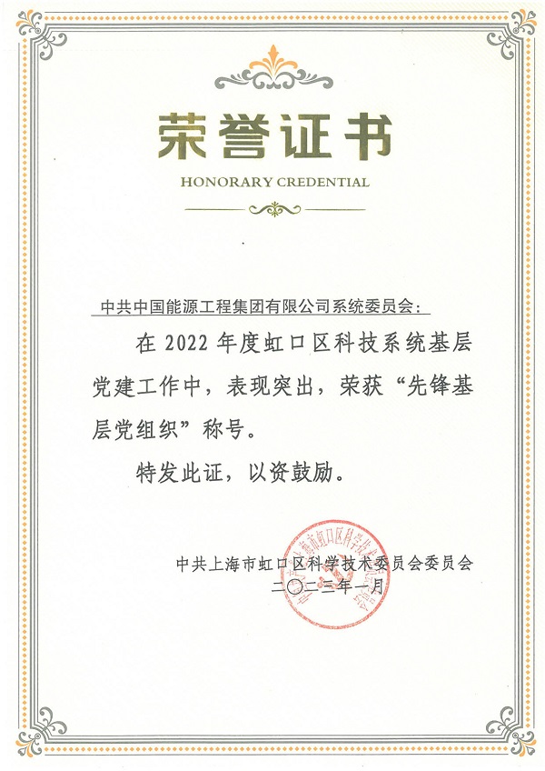 會(huì)議的最后,對(duì)虹口區(qū)科技系統(tǒng)基層黨建工作中表現(xiàn)突出的黨組織進(jìn)行了表彰,中國(guó)能源工程集團(tuán)有限公司系統(tǒng)黨委榮獲2022年度“先鋒基層黨組織”榮譽(yù)稱(chēng)號(hào)。