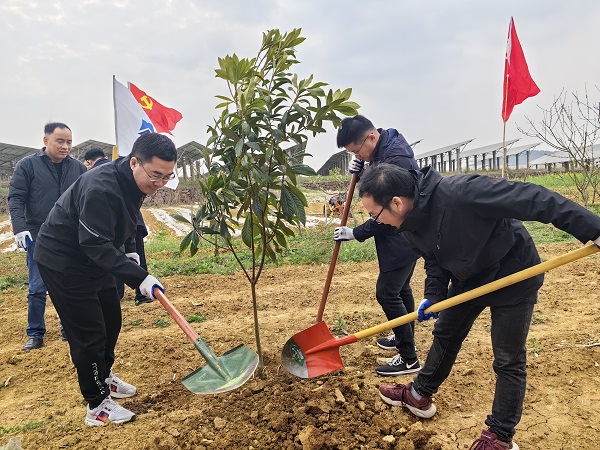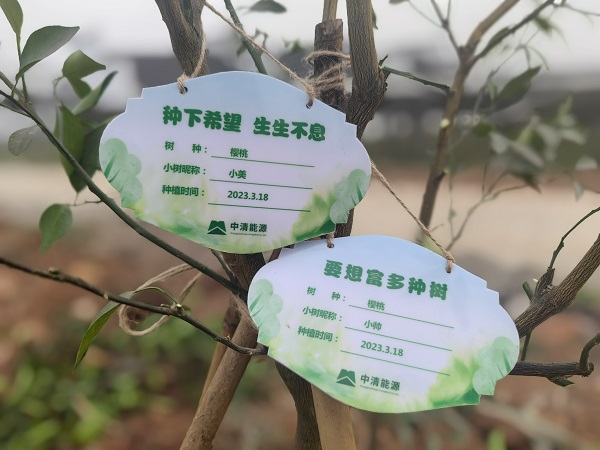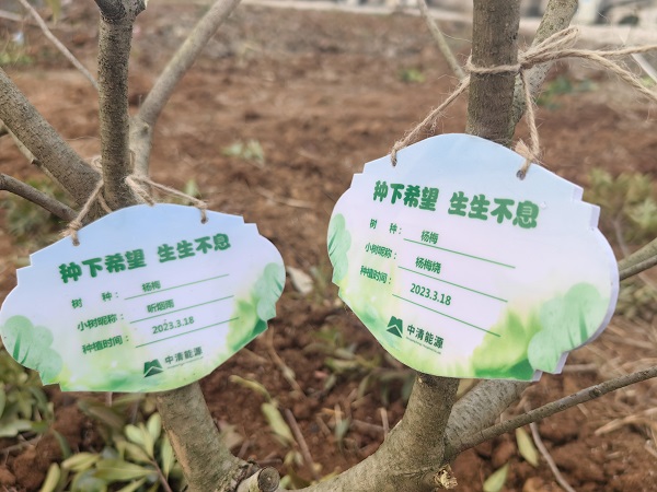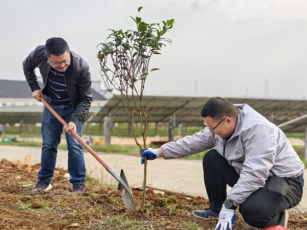 在栽種現(xiàn)場,職工們配合默契、忙碌有序,或提著水桶、或捧著小樹苗、或端著鐵鍬忙碌在植樹間,員工們還給自己種下的小樹命名,為自己種的樹苗賦予了更多的意義。經(jīng)過一個下午的勞動,楊梅、枇杷、紅美人等40多棵樹苗順利在安吉光伏項(xiàng)目“安家落戶”。